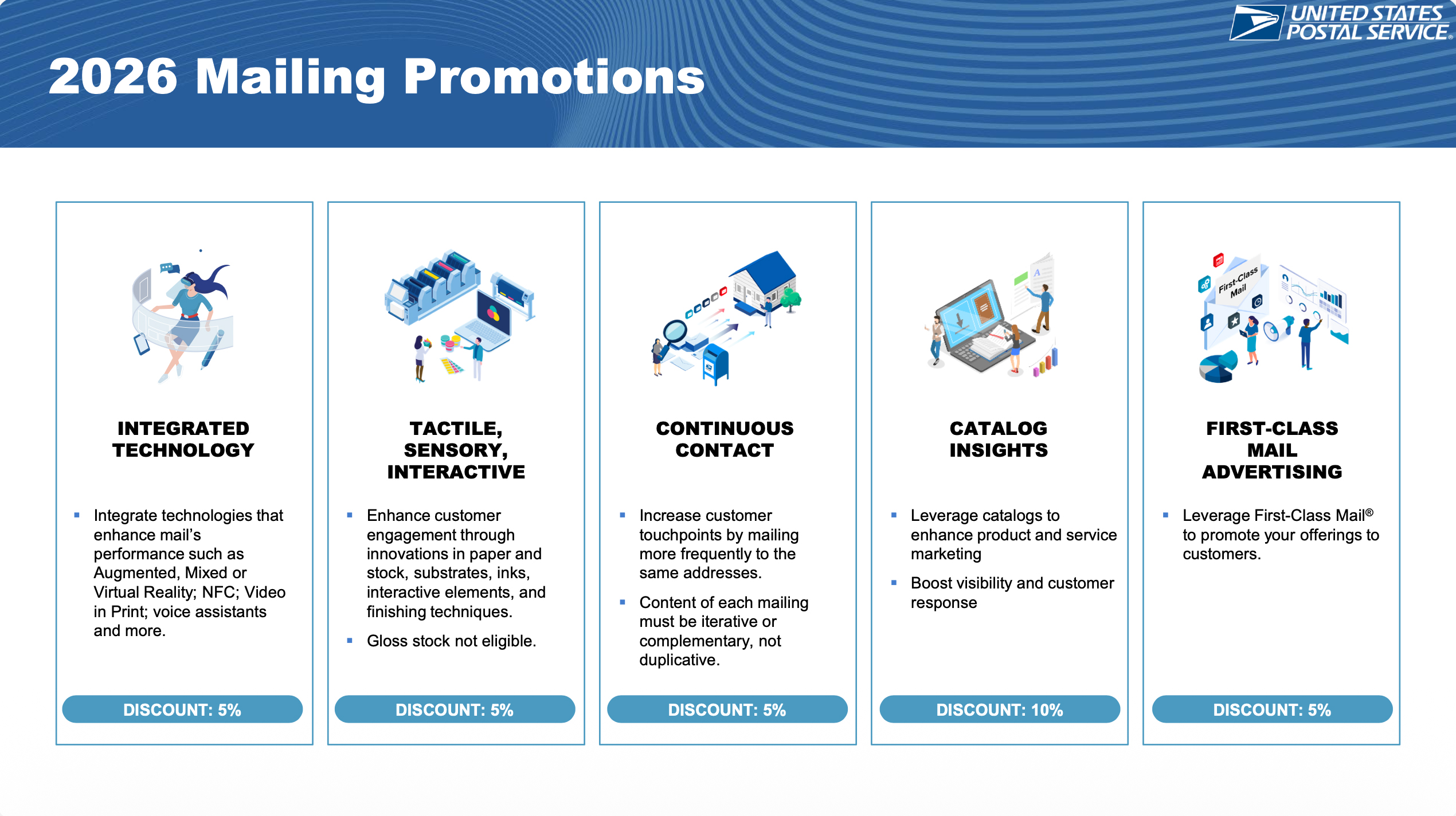 She concluded by suggesting that it pays to let USPS help you succeed. “From test to home run,” Lewis said, “take advantage of USPS promotions discounts to test all of these techniques and get the most out of the mail.”